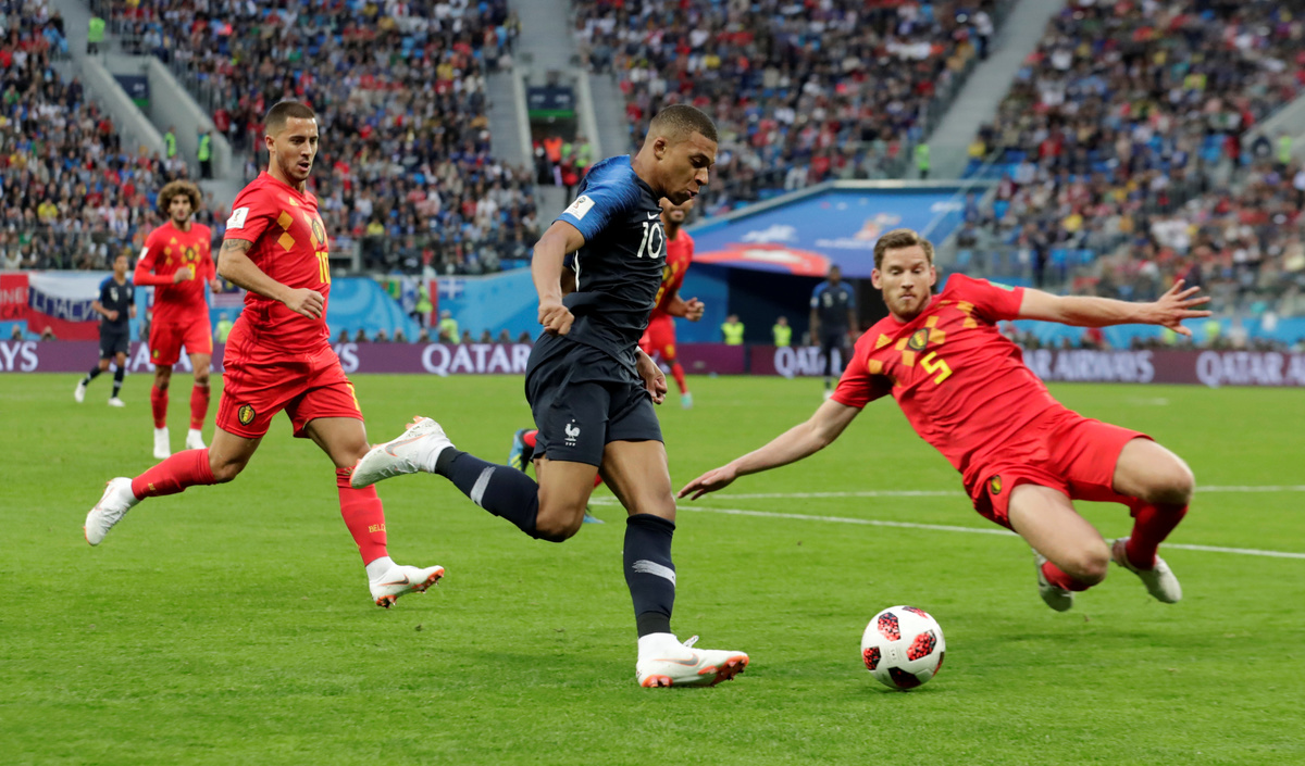 France's Kylian Mbappe in action with Belgium's Eden Hazard and Jan Vertonghen.