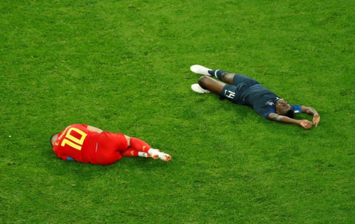 Soccer Football - World Cup - Semi Final - France v Belgium - Saint Petersburg Stadium, Saint Petersburg, Russia - July 10, 2018 France's Blaise Matuidi and Belgium's Eden Hazard lie on the pitch after sustaining an injury REUTERS/Anton Vaganov