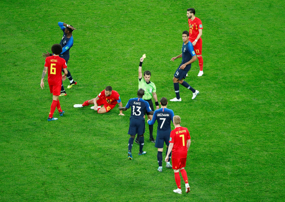 Soccer Football - World Cup - Semi Final - France v Belgium - Saint Petersburg Stadium, Saint Petersburg, Russia - July 10, 2018 France's N'Golo Kante is shown a yellow card by referee Andres Cunha REUTERS/Max Rossi