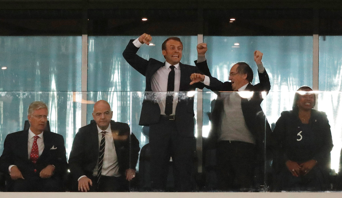 Soccer Football - World Cup - Semi Final - France v Belgium - Saint Petersburg Stadium, Saint Petersburg, Russia - July 10, 2018 President of France Emmanuel Macron (C) celebrates as King Philippe of Belgium (L) looks on alongside FIFA president Gianni Infantino at the end of the match REUTERS/Toru Hanai