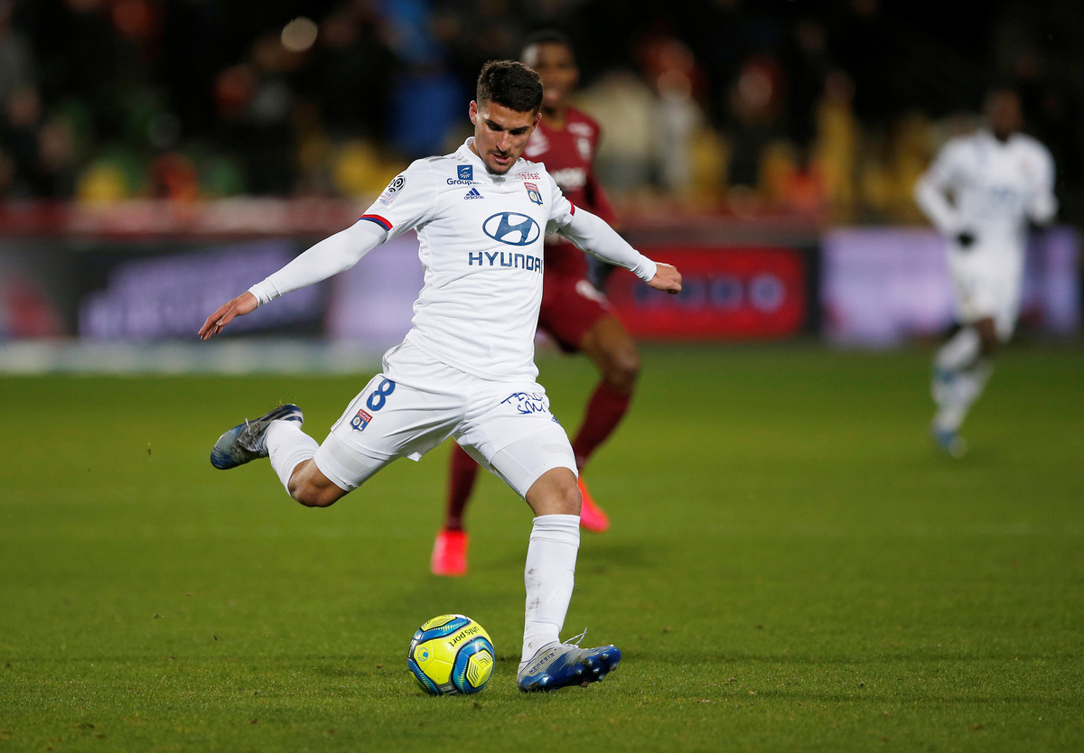 Soccer France - Ligue 1 - Metz v Olympique Lyonnais - Stade Saint-Symphorien, Metz, France - February 21, 2020 Olympique Lyonnais' Houssem Aouar scores their second goal REUTERS/Pascal Rossignol