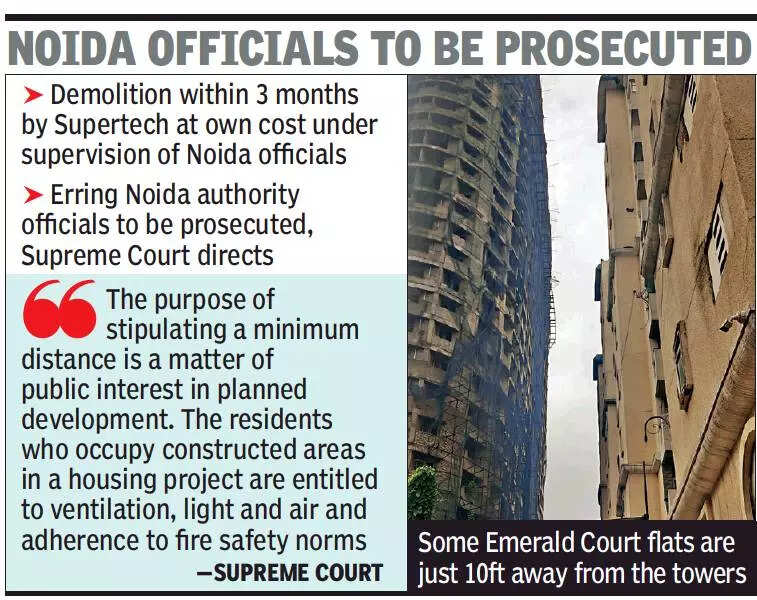 NEW DELHI: The Supreme Court on Tuesday directed real estate major Supertech to demolish two 40-storey towers additionally constructed in one of its housing projects in Noida after holding that the construction was done in violation of law and in collusion with the Noida authority, whose erring officials were also directed to be prosecuted.