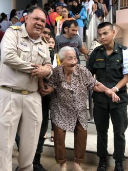 Lanyin Sae-lee, a 100-year-old resident of Yala, is supported by officers as she arrives at a polling station in Suratthani School in Muang district of Surat Thani yesterday. Supapong Chaolan