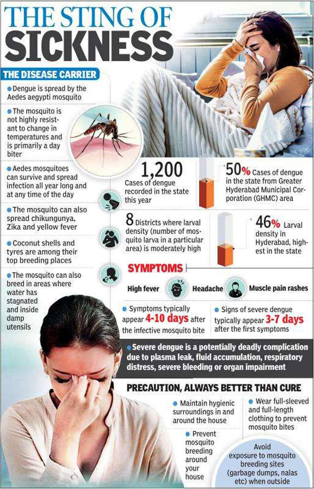 HYDERABAD: A huge jump in dengue cases is being reported from hospitals and clinics across the city, with individual doctors seeing up to 20 cases each daily since the past eight to ten days. Health authorities have also sounded an alert on the rising dengue and malaria cases. With focus currently on Covid-19 and symptoms of dengue being similar, health officials are worried about missing cases and misdiagnosis.
