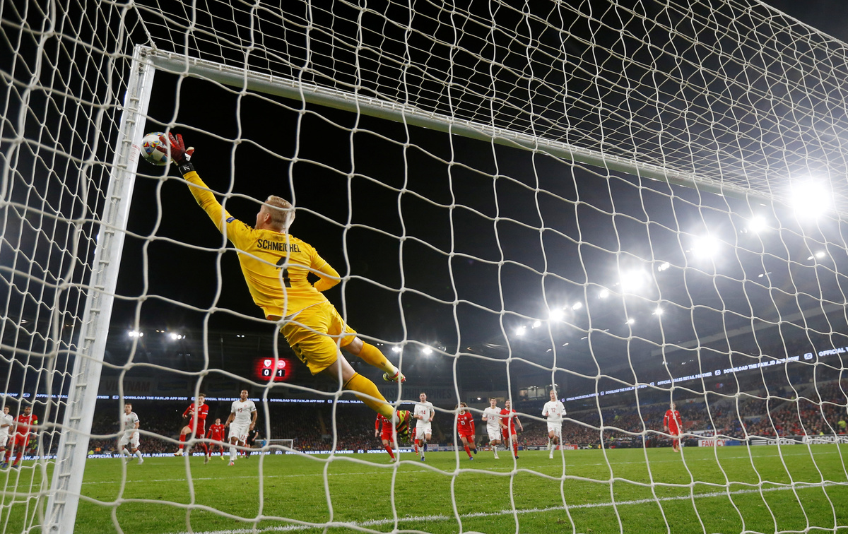 Denmark's Kasper Schmeichel had to be at his best to keep out a stunning late free kick by Bale which he palmed away as it arrowed towards the top right-hand corner of his goal.