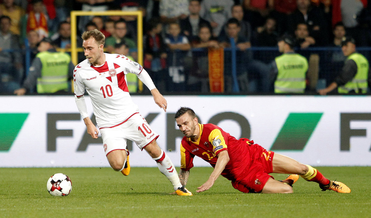 Soccer Football - 2018 World Cup Qualifications - Europe - Montenegro vs Denmark - Podgorica City Stadium, Podgorica, Montenegro - October 5, 2017 Denmark's Christian Eriksen in action with Montenegro’s Marko Simic REUTERS/Stevo Vasiljevic