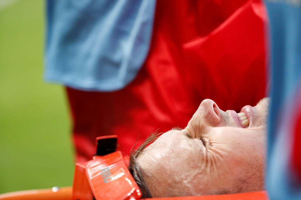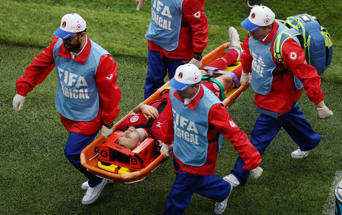 Soccer Football - World Cup - Group C - Peru vs Denmark - Mordovia Arena, Saransk, Russia - June 16, 2018 Denmark's William Kvist is taken off the pitch on a stretcher after sustaining an injury REUTERS/Ricardo Moraes
