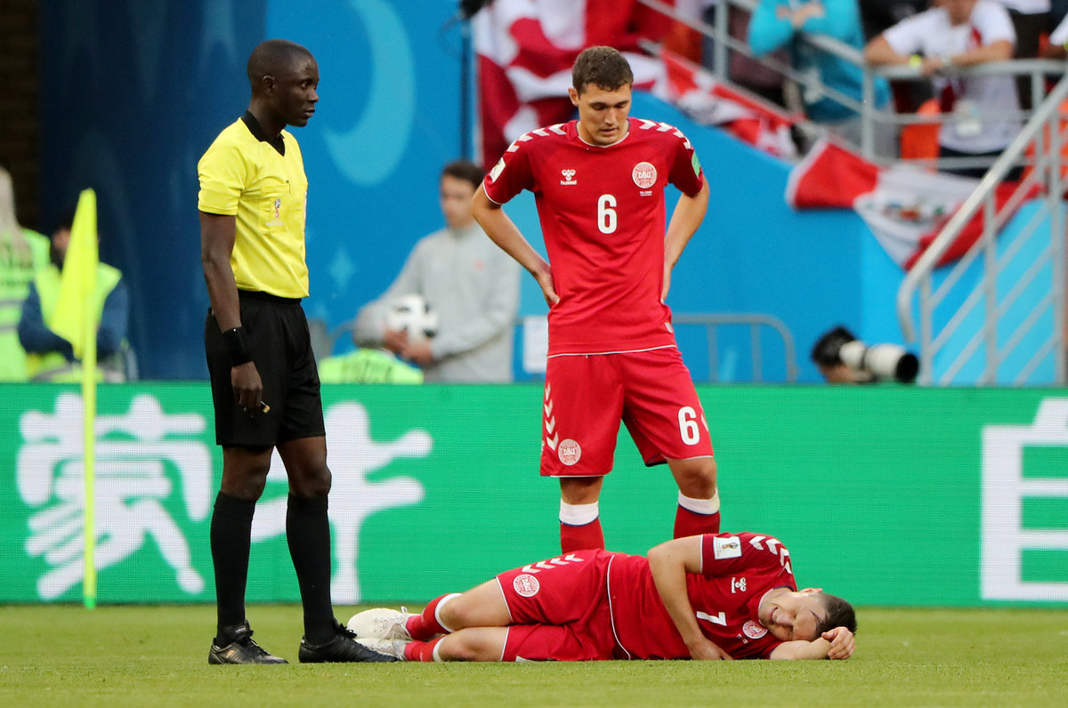 Soccer Football - World Cup - Group C - Peru vs Denmark - Mordovia Arena, Saransk, Russia - June 16, 2018 Denmark's William Kvist goes down with an injury after colliding with Peru's Jefferson Farfan REUTERS/Marcos BrindicciSoccer Football - World Cup - Group C - Peru vs Denmark - Mordovia Arena, Saransk, Russia - June 16, 2018 Denmark's William Kvist lies on the pitch after sustaining an injury REUTERS/Ricardo Moraes