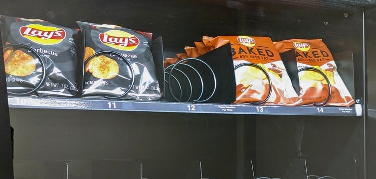 Our first study involved a vending machine choice between a medium-sized bag of Lay’s Baked BBQ potato chips and a smaller package of the regular version – both 150 calories. Participants who took a survey in which they reported frequently trying to cut back on their eating — for example, by taking smaller servings and skipping meals — opted for the larger bag of baked chips. We got similar results over four additional studies involving other snacks, such as popcorn and cookies.