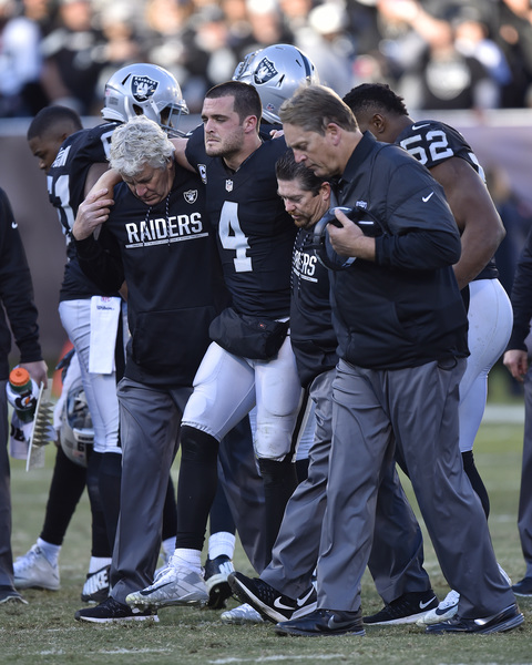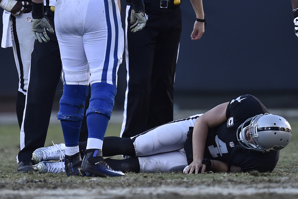 Quarterback and MVP candidate Derek Carr broke his right fibula and the Raiders' 33-25 win over the Indianapolis Colts suddenly became secondary.