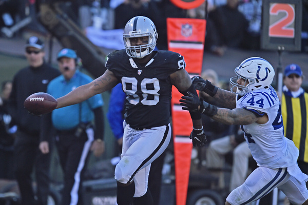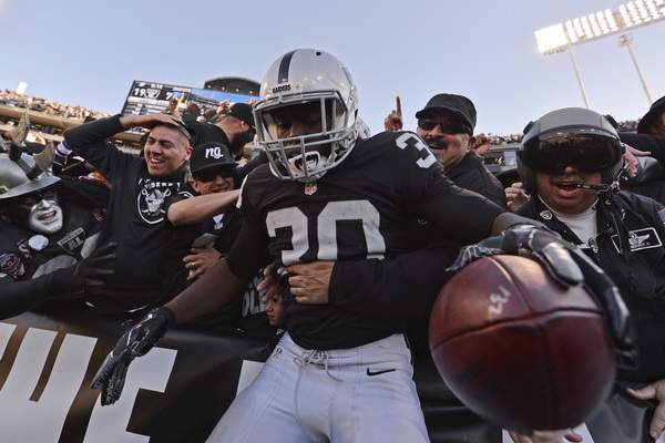 The Raiders intercepted Andrew Luck twice, including Reggie Nelson's pick in the end zone late in the second quarter. That allowed the Raiders to take a 19-7 lead going into halftime with a quick drive that culminated in a 4-yard touchdown catch by Richard that sent him leaping into the Black Hole.