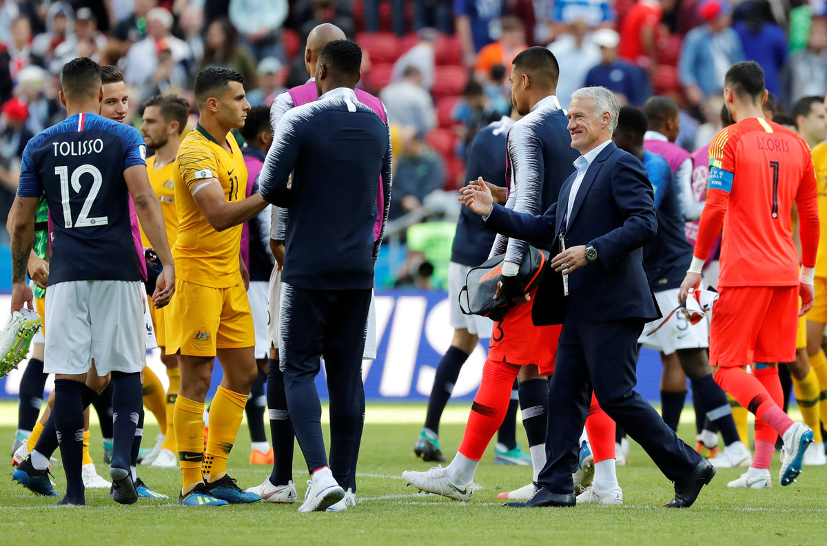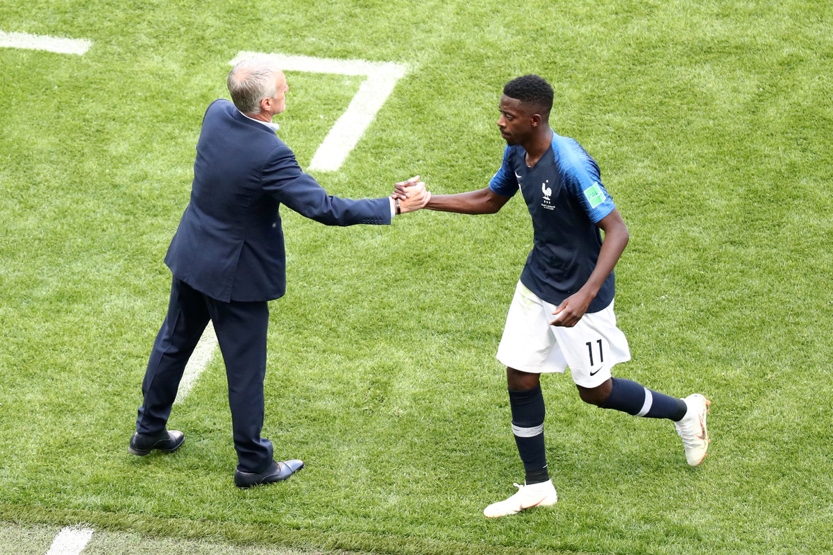 Soccer Football - World Cup - Group C - France vs Australia - Kazan Arena, Kazan, Russia - June 16, 2018 France's Ousmane Dembele shakes hands with France coach Didier Deschamps as he comes off the pitch REUTERS/Sergio PerezSoccer Football - World Cup - Group C - France vs Australia - Kazan Arena, Kazan, Russia - June 16, 2018 France's Antoine Griezmann scores their first goal from a penalty REUTERS/John Sibley FILE PHOTO: Soccer Football - World Cup - Group C - France vs Australia - Kazan Arena, Kazan, Russia - June 16, 2018 France's Antoine Griezmann prepares to take a penalty while Australia's Mathew Ryan speaks with referee Andres Cunha REUTERS/John Sibley/File Photo