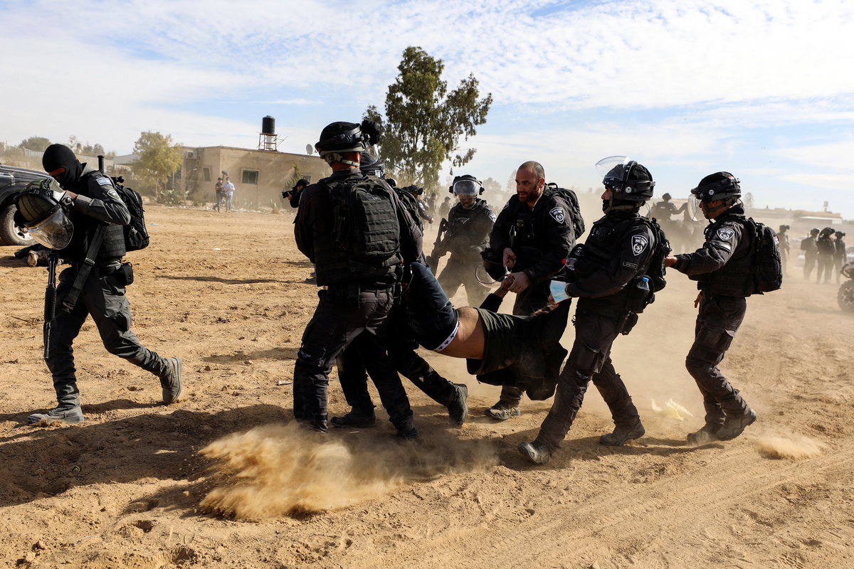 At the Negev village of Sawe al-Atrash, Bedouin scuffled with riot police on Wednesday after a night in which authorities said protesters blocked roads, stoned motorists and forced a train to halt by piling rocks on its tracks.