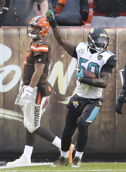 The Browns got the ball back at their 20 with 1:24 remaining after the Jaguars punted. But Kizer was strip-sacked again, this time by Ngakoue, who beat left tackle Spencer Drango off the edge. Linebacker Telvin Smith recovered the fumble in the end zone for a touchdown, extending the Jaguars' lead to 19-7 with 1:14 left.