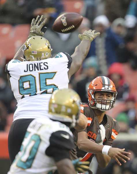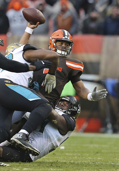 As the Browns were driving with a chance to earn their first win this year, rookie quarterback DeShone Kizer was sacked on third-and-10 at Jacksonville's 40-yard line by defensive ends Calais Campbell and Yannick Ngakoue. Campbell forced Kizer to fumble, and the Jaguars (7-3) recovered with 1:44 left at their 44.