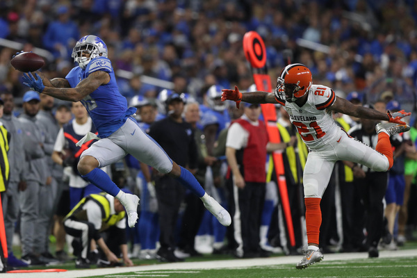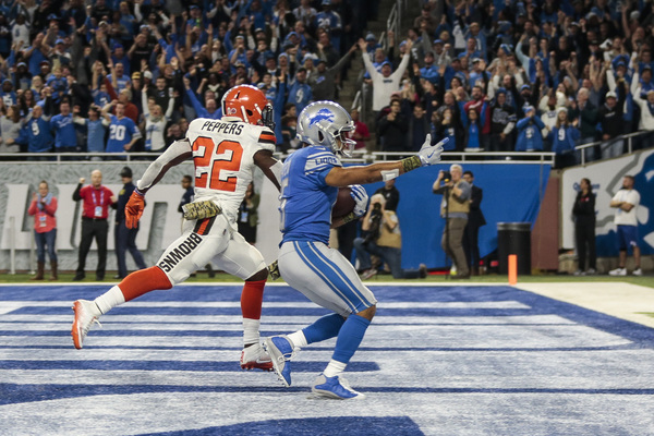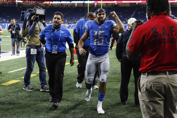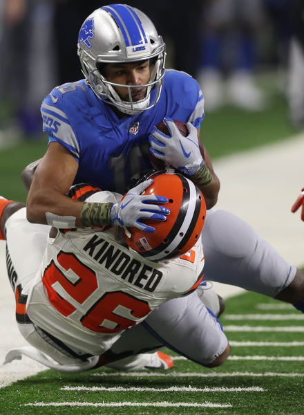 After Kizer suffered the injury to his ribs, the Lions (5-4) got the ball back and went ahead 31-24 when tight end Eric Ebron beat safety Derrick Kindred and caught a 29-yard touchdown pass from quarterback Matthew Stafford with 10:46 left in the fourth quarter. The Lions made it 38-24 when wide receiver Golden Tate caught a short pass and turned it into a 40-yard touchdown with 4:28 remaining.