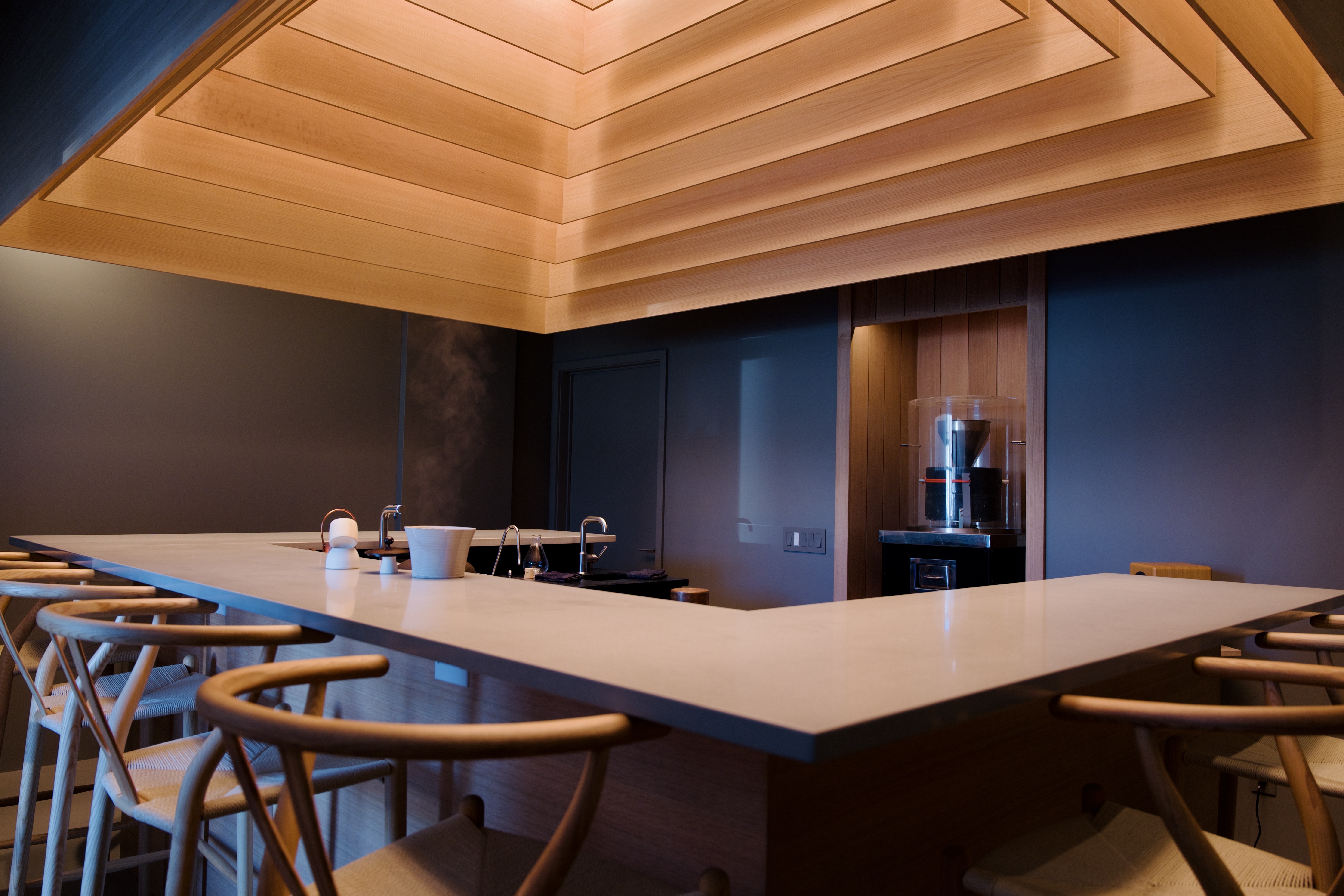 In Brooklyn, a new private tasting room, Kettl Matcha Sen Mon Ten, does exactly that: an experiential space by the local Kettl label. A U-shaped bar sits beneath a sculptural ceiling— a tiered canopy complete with nested planes of warm wood, an almost pagoda-like shape. Soft lighting highlights the layers, creating a cocooning atmosphere. Across the river in Manhattan, Sōrate opened just around the corner from me in the Flatiron District.