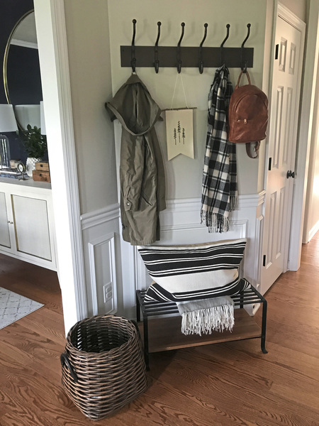 In the hall, she set up a coat rack and bench with a catch-all wicker basket.