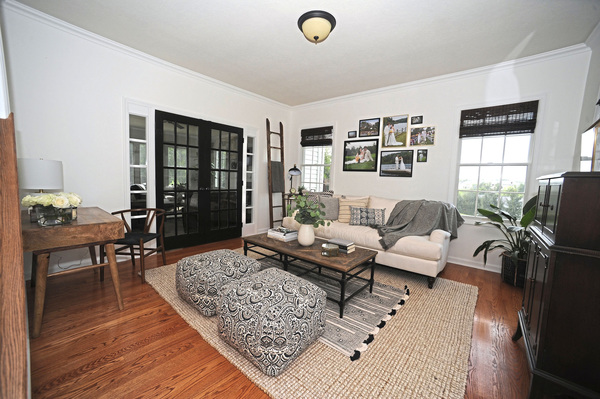 She hunts flea markets, antique shops, the internet, and Target and Marshall's with equal fervor. A perfect example of her ability to blend is the living room, which includes a bar that was her great grandfather's, a ladder from an antique shop, poufs from HomeGoods, a sofa and coffee table from Pottery Barn, and a cool area rug under the coffee table from TJ Maxx.