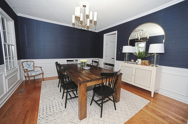 The walls of the dining room, which were formerly deep red, are now dressed in a navy blue grasscloth; wainscoting and molding are painted a white semi-gloss. Her son's room is also wallpapered in a neutral print.
