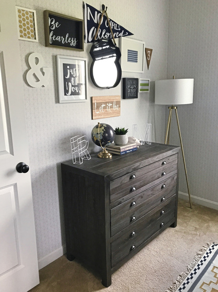 Her son's bedroom is a mix of Restoration Hardware and fun finds. "I wanted his room to be something he could grow into, so I went with the larger bed and the lower dresser so he could feel independent as well."