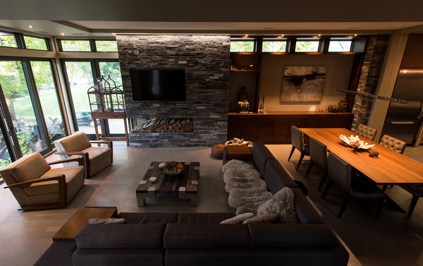 The house is not large, about 2,500 square feet, but every space was designed to make the most of Lake Calhoun. Walls of glass _ windows and sliding doors from Marvin Windows and Doors' Integrity Wood-Ultrex line _ frame expansive views of the lake. A stone accent wall in the living room holds a cutout for stacked firewood _ but no fireplace. "We chose not to have one," said Ashii. "We cut out the corner so you could see the lake. That's more important than a fireplace."