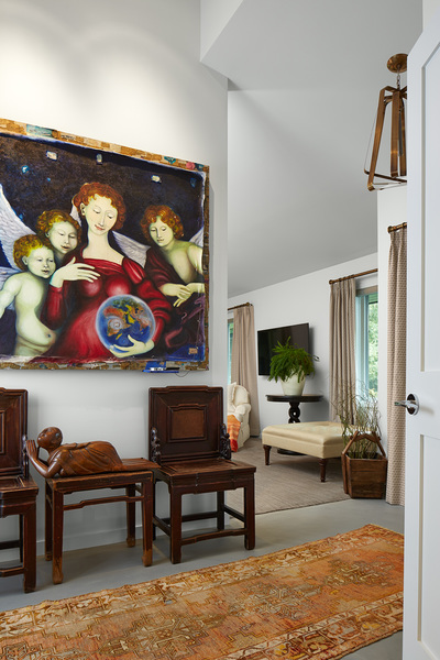 As part of the extreme makeover, Peterson also did "nips and tucks to connect the spaces visually," he said. The final floor plan of reconfigured spaces includes five bedrooms and six bathrooms. To let in more light, Peterson also added big picture windows to the front of the home. When visitors approach the front entry, they can admire an oil painting the couple bought in Shanghai through one of the new windows.