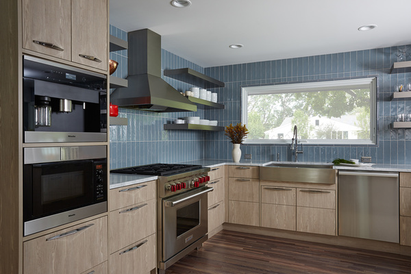 Fries completed her one-of-a-kind kitchen with laminate cabinets accented with a textural "driftwood" finish and floating open shelves wrapped in stainless-steel veneer. "No one has to ask where the wine glasses are," she said.