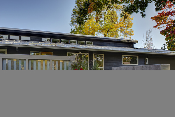 The rambler refresher course also extended to the home's facade. "The tired exterior needed new color and materials," said Peterson, who replaced the old asphalt roof with a shiny metal one. "Now it really has a midcentury modern feel."