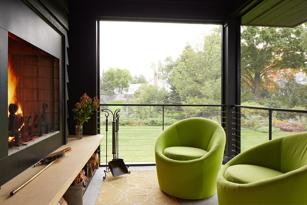 Inside the addition, the new owners' bedroom has a vaulted ceiling punctuated with clerestory windows to match the home's original architecture. Michelle chose minimalist industrial elements, such as a heated concrete floor and a rebar railing around an intimate screen porch off the suite.