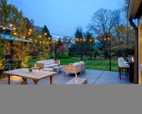 Peterson angled the 980-square-foot addition out the back of the home, creating a spot for a private U-shaped backyard patio outfitted with a bar and seating for outdoor entertaining. "We never sat outside at the old house," said David. "Here the inside and outside flow together."