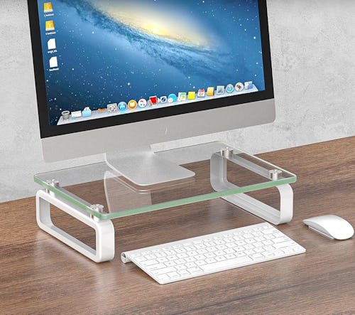 Staring down at your computer screen for long periods of time can leave your neck feeling sore. Luckily, this riser is an easy fix. Not only does it lift your screen up to eye level, but it also creates storage space underneath for notebooks, electronics, and everything in between. Plus, the tempered glass frame can easily support up to 88 pounds.