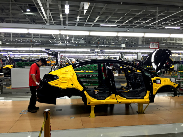 In a welding area at the center of the assembly line, more than 300 automated machines work in concert with one another to fuse sedan doors to roofs and attach trunks to bumpers.
