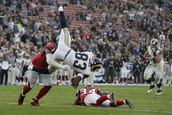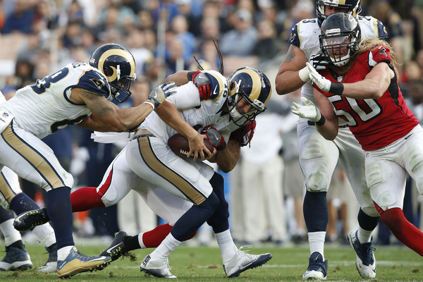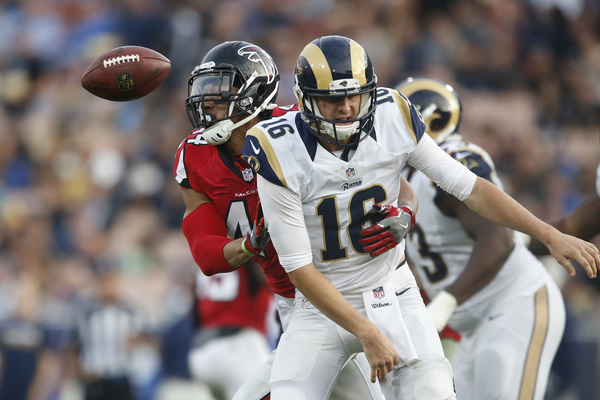 On defense, the Falcons have struggled with their opening drives. The Rams drove down to the Falcons' 16. On third-and-3, Rams quarterback Jared Goff's pass intended for wide receiver Kenny Britt was intercepted by free safety Ricardo Allen.