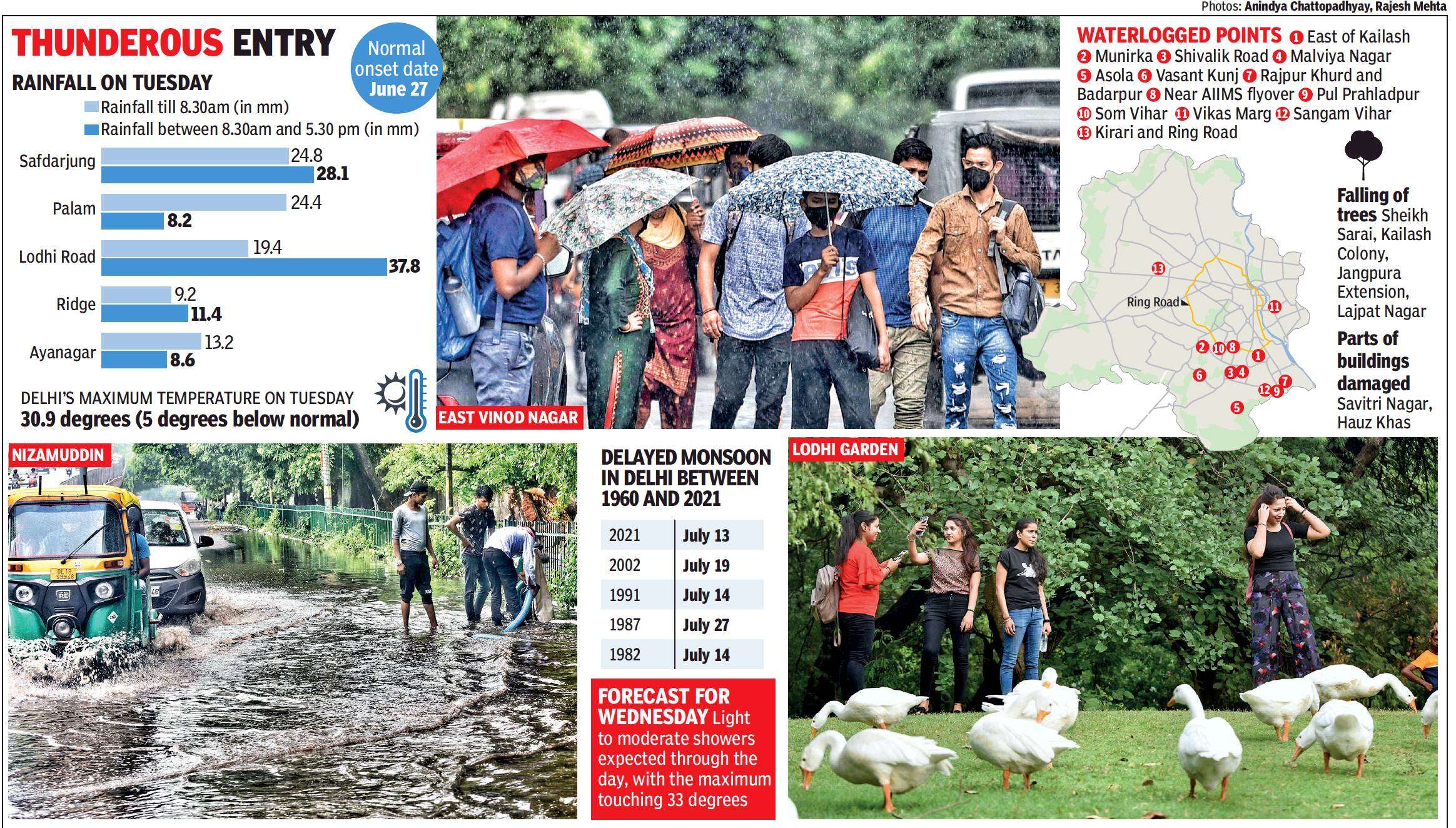 NEW DELHI: After the delayed onset of monsoon over Delhi on Tuesday, late by almost a month from the earliest prediction of June 15, India Meteorological Department said the rainy season will be ‘normal’ or ‘below normal’ in the capital. From June 1 to July 13, the capital recorded a rain deficit of 65% of the normal for the period. However, Met officials said even though the monsoon arrived late in the city, that deficit was likely to be covered during the season.