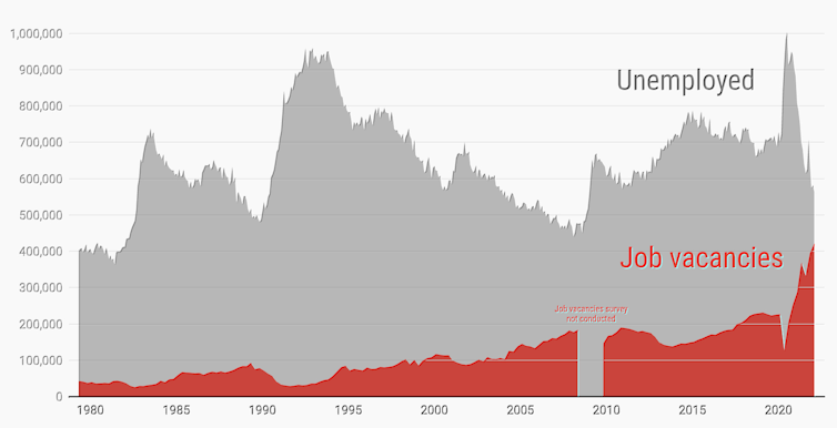 What this means is that in February 2022 there were only 1.3 unemployed people chasing each vacant job, the smallest ratio on record — down from three unemployed people for each vacancy in 2020, five for each vacancy in 2000, and seven in 1990.