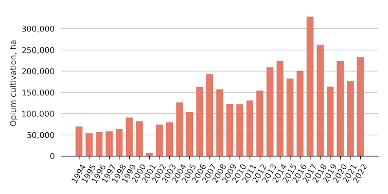 But recent figures released by the United Nation’s Office on Drugs and Crime (UNODC) suggest that – thus far – the ban has been ineffective. By 2022, the area of land under opium cultivation had increased by 32%, or 56,000 hectares, compared to the previous year. The 2022 crop was the third-largest area under cultivation since UNODC began monitoring in 1994, as the graph below shows.