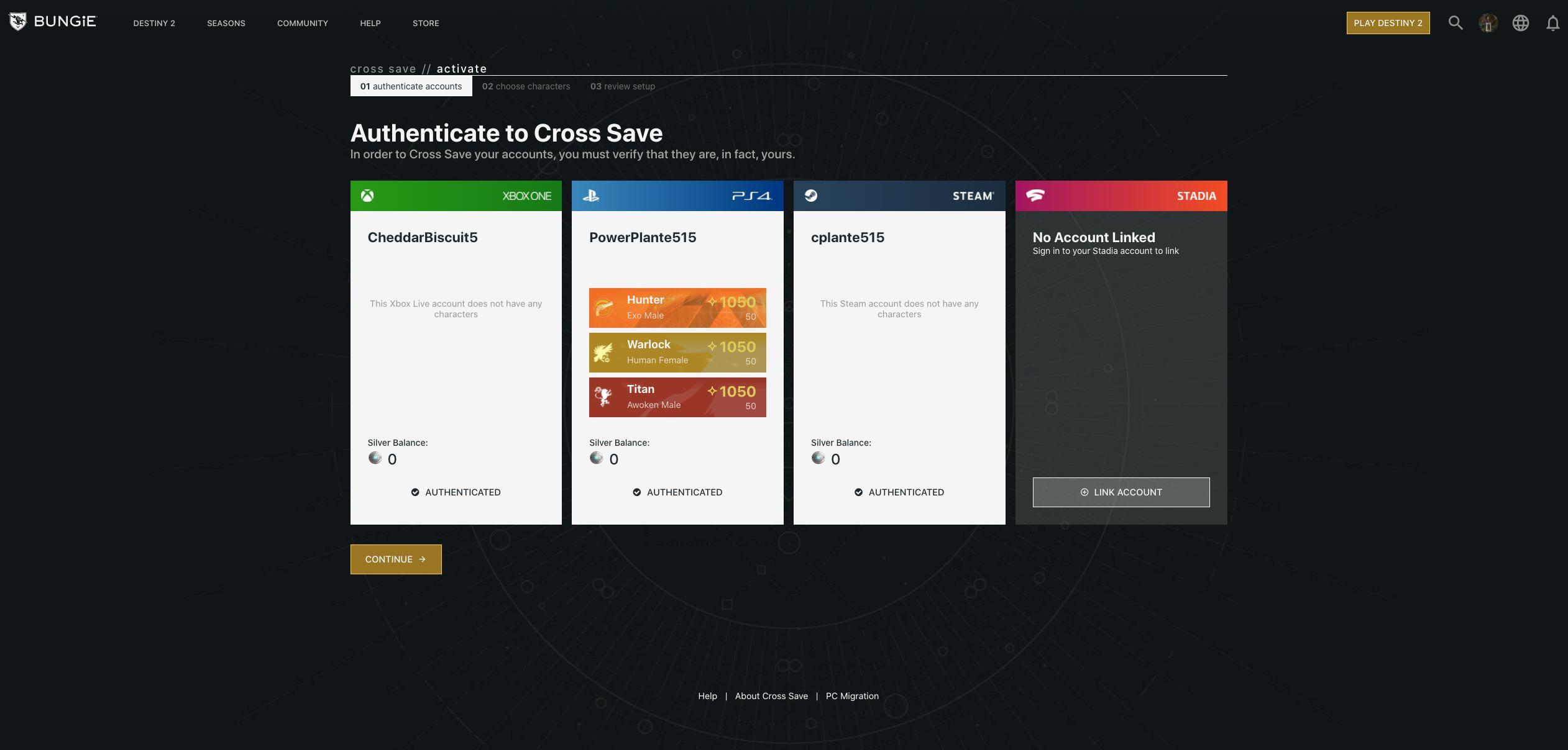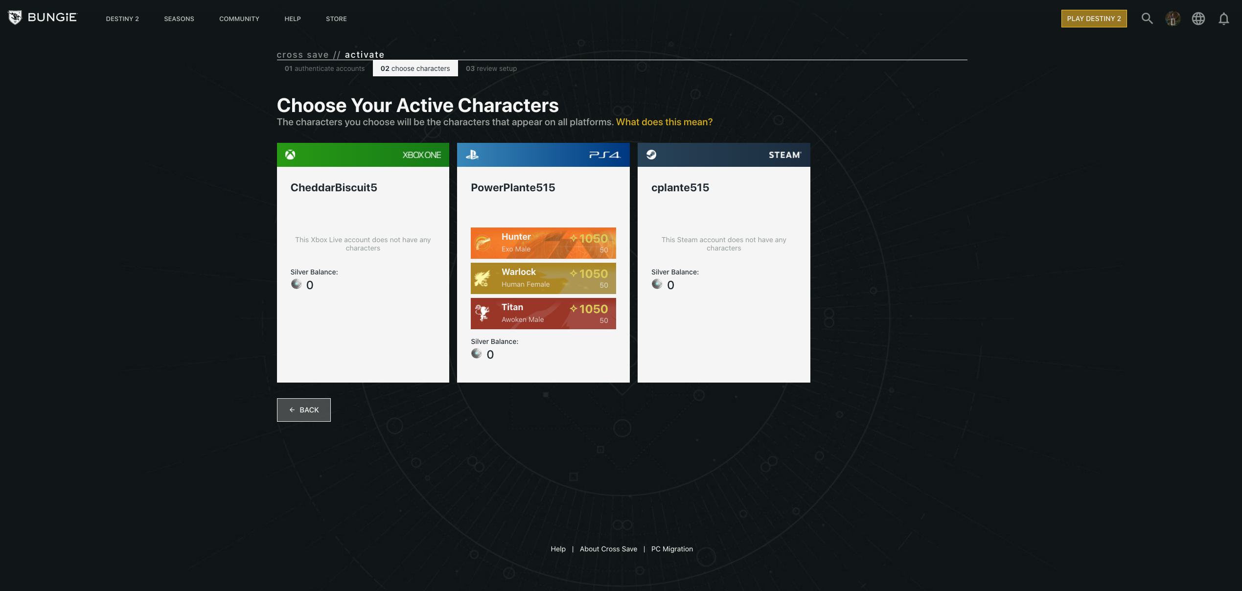 The next major step has you select only one set of characters as your primary. You can create up to three characters on each platform, but you have to choose just one trio and sacrifice all others. So you can't mix and match by teaming your PS4 Hunter up with your Xbox One Warlock.