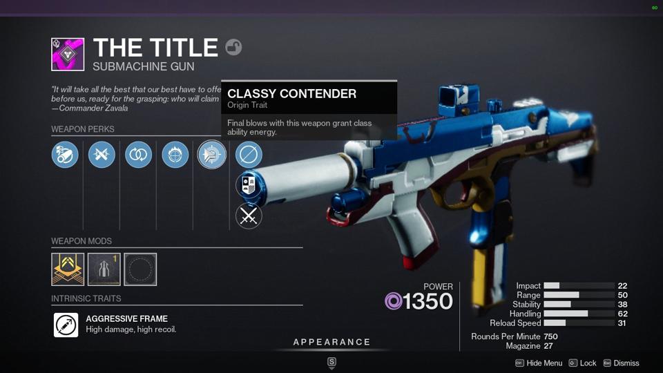 The Title’s unique Origin Trait is Classy Contender, where Final Blows with the weapon grant Class Ability energy. As a void SMG, you can already imagine how this would be extremely good on say, a Secant Filaments Warlock for constantly spamming rifts and orb buddies. And it’s only on this weapon, and only for the three weeks the event is live.