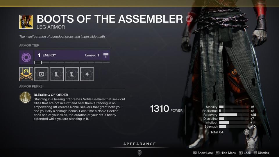 Boots of the Assembler (Warlock) – Now, here’s what might be the most interesting exotic of the bunch. It allows you to put down your rift and shooting out seeking rounds that either instantly heal your allies or give them a damage buff, depending on your rift, making you the ultimate support class and synergizing especially well with Well of Radiance tree.