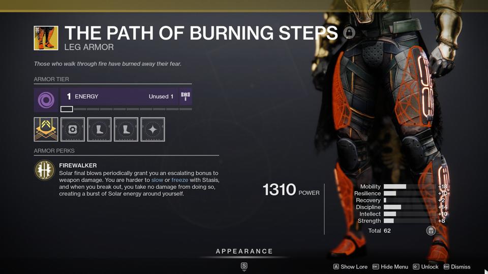 The boots make you harder to freeze and slow, plus they buff weapon damage on solar final blows. While this is meant to be used with a solar subclass, you can still just wear them on Behemoth Titan (using a solar energy weapon) and wield Stasis while being far less hampered by Stasis yourself. This one could be trouble.