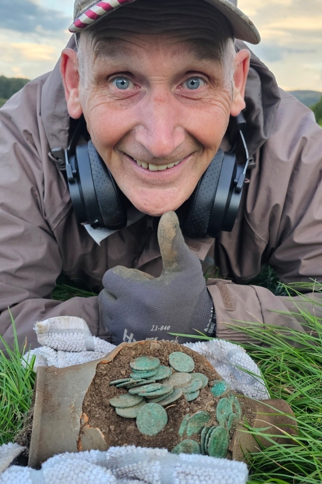 David Moss, 36, was out in a “virtually untouched” area of north Wales with his metal detector when he came across two clay pots containing around 15,000 Roman coins.