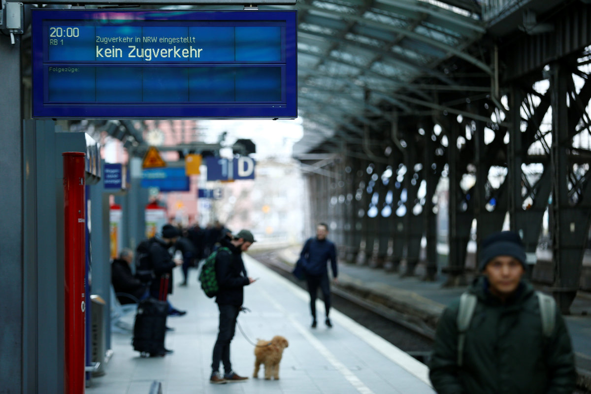 A sign reads "train services stopped in North Rhine-Westphalia" at Cologne's main railway station, Germany January 18, 2018. REUTERS/Thilo Schmuelgen