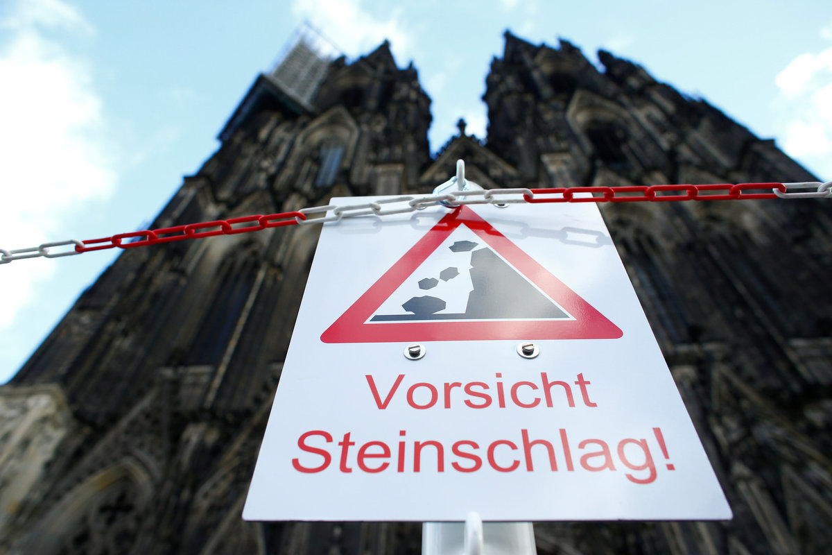 Firefighters work by a fallen tree during stormy weather in Hanau, Germany, January 18, 2018. REUTERS/Kai PfaffenbachA sign reads "attention stones" in front of the Cologne Cathedral during heavy winds in Cologne, Germany January 18, 2018. REUTERS/Thilo Schmuelgen