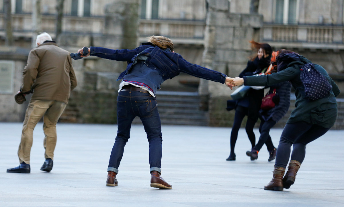 People hold each other as they struggle during heavy winds in downtown Cologne, Germany January 18, 2018. REUTERS/Thilo Schmuelgen