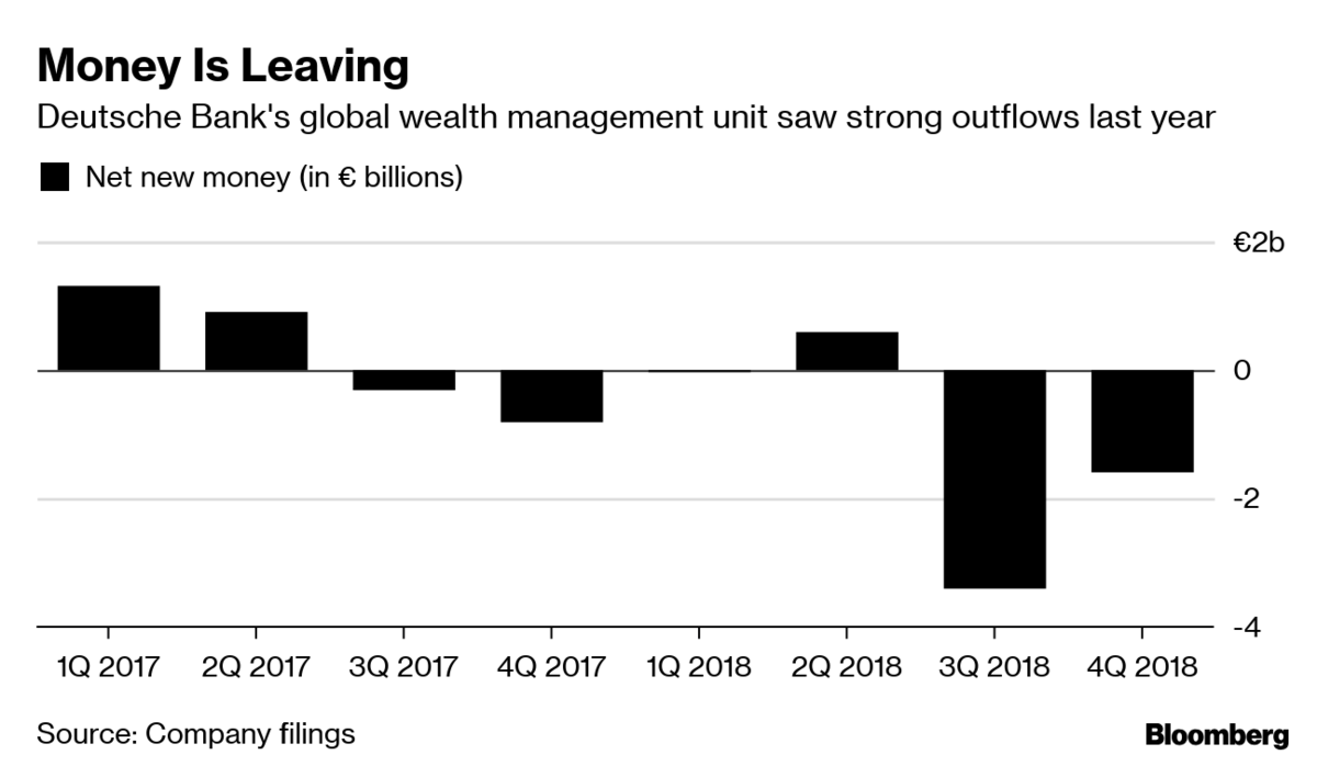 Revenue at Deutsche Bank’s overall wealth operations, headed by Fabrizio Campelli, shrunk by 14 percent last year. EMEA was particularly hard hit, partly by the introduction of Europe’s MiFID II regulation, which has driven up costs and weighed on client activity. Deutsche Bank’s global wealth management unit saw clients pull 4.4 billion euros of money last year, or about 2 percent of assets under management.