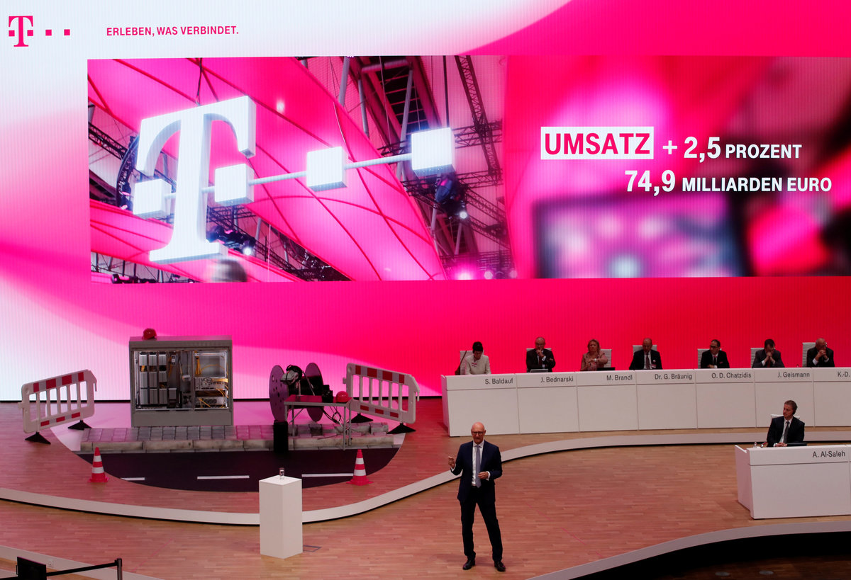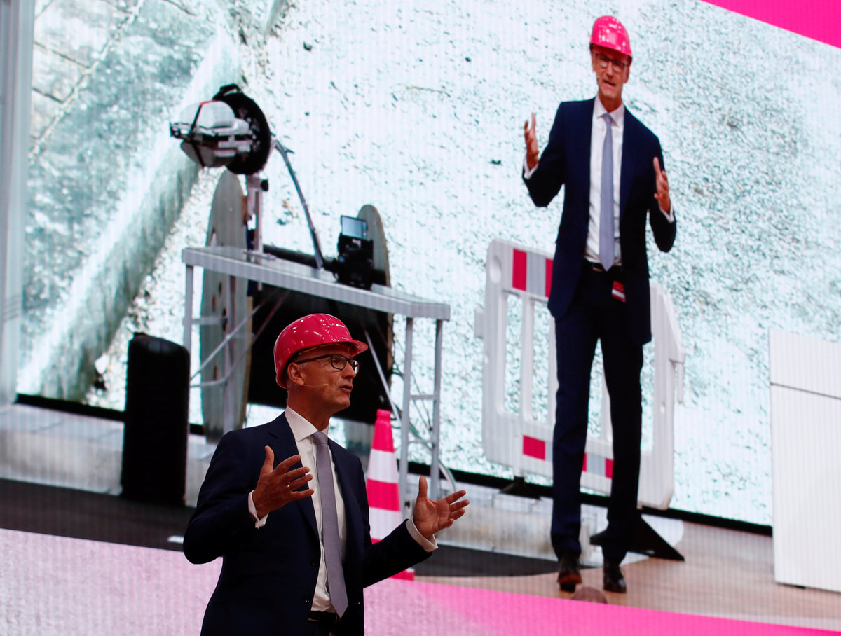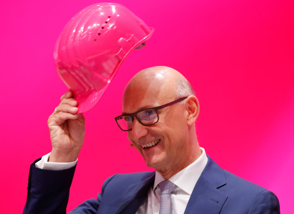 Timotheus Hoettges, Chief Executive Officer of Germany's telecommunications giant Deutsche Telekom AG, poses before the annual shareholders' meeting of the company in Bonn, Germany May 17, 2018. REUTERS/Wolfgang RattayTimotheus Hoettges, Chief Executive Officer of Germany's telecommunications giant Deutsche Telekom AG, speaks at the annual shareholders' meeting of the company in Bonn, Germany May 17, 2018. REUTERS/Wolfgang RattayTimotheus Hoettges, Chief Executive Officer of Germany's telecommunications giant Deutsche Telekom AG, speaks during the annual shareholders' meeting of the company in Bonn, Germany May 17, 2018. REUTERS/Wolfgang RattayTimotheus Hoettges, Chief Executive Officer of Germany's telecommunications giant Deutsche Telekom AG, speaks during the annual shareholders' meeting of the company in Bonn, Germany May 17, 2018. REUTERS/Wolfgang RattayTimotheus Hoettges, Chief Executive Officer of Germany's telecommunications giant Deutsche Telekom AG, takes off his helmet as he poses for a picture at the annual shareholders' meeting of the company in Bonn, Germany May 17, 2018. REUTERS/Wolfgang RattayTimotheus Hoettges, Chief Executive Officer of Germany's telecommunications giant Deutsche Telekom AG, speaks during the annual shareholders' meeting of the company in Bonn, Germany May 17, 2018. REUTERS/Wolfgang RattayTimotheus Hoettges, Chief Executive Officer of Germany's telecommunications giant Deutsche Telekom AG, and chairman of the supervisory board Ulrich Lehner look on before the annual shareholders' meeting of the company in Bonn, Germany May 17, 2018. REUTERS/Wolfgang RattayTimotheus Hoettges (C), Chief Executive Officer of Germany's telecommunications giant Deutsche Telekom AG, poses with board members before the annual shareholders' meeting of the company in Bonn, Germany May 17, 2018. REUTERS/Wolfgang RattayTimotheus Hoettges, Chief Executive Officer of Germany's telecommunications giant Deutsche Telekom AG, and chairman of the supervisory board Ulrich Lehner pose before the annual shareholders' meeting of the company in Bonn, Germany May 17, 2018. REUTERS/Wolfgang Rattay