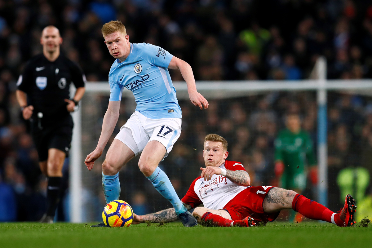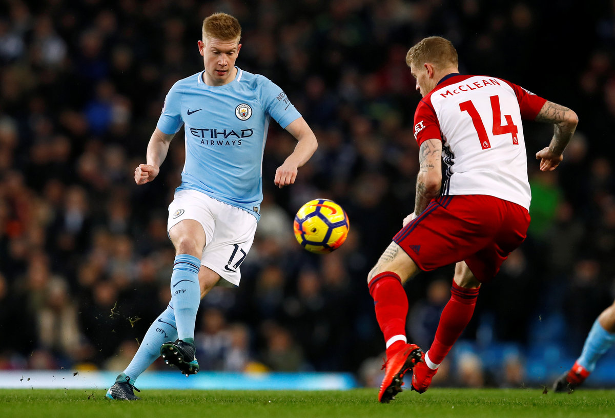 Soccer Football - Premier League - Manchester City vs West Bromwich Albion - Etihad Stadium, Manchester, Britain - January 31, 2018 Manchester City's Kevin De Bruyne in action with West Bromwich Albion's James McClean Action Images via Reuters/Jason Cairnduff