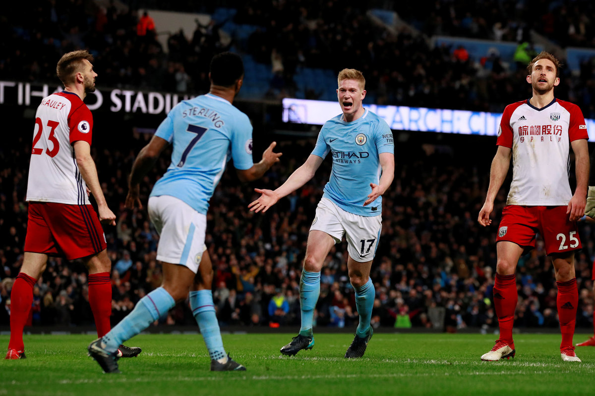 Soccer Football - Premier League - Manchester City vs West Bromwich Albion - Etihad Stadium, Manchester, Britain - January 31, 2018 Manchester City's Kevin De Bruyne celebrates with Raheem Sterling after scoring their second goal Action Images via Reuters/Jason Cairnduff