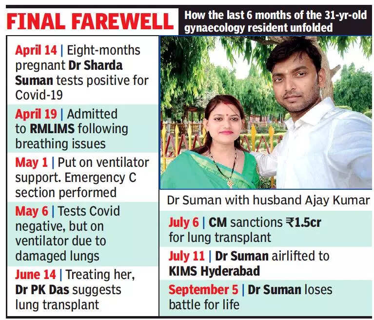 When the infection damaged her lungs, she was airlifted to KIMS Hospital, Hyderabad, on July 11 where she breathed her last on Sunday night. The transplant could not take place due to a complication in trachea and food pipe. Faculty members, batchmates and institute staff paid tributes to Dr Suman for her dedication to work and prayed for the wellbeing of her husband Dr Ajay Kumar and her five-month old daughter, whom she gave birth while on ventilator. They remembered her as a soft-spoken, hardworking and kind-hearted doctor.